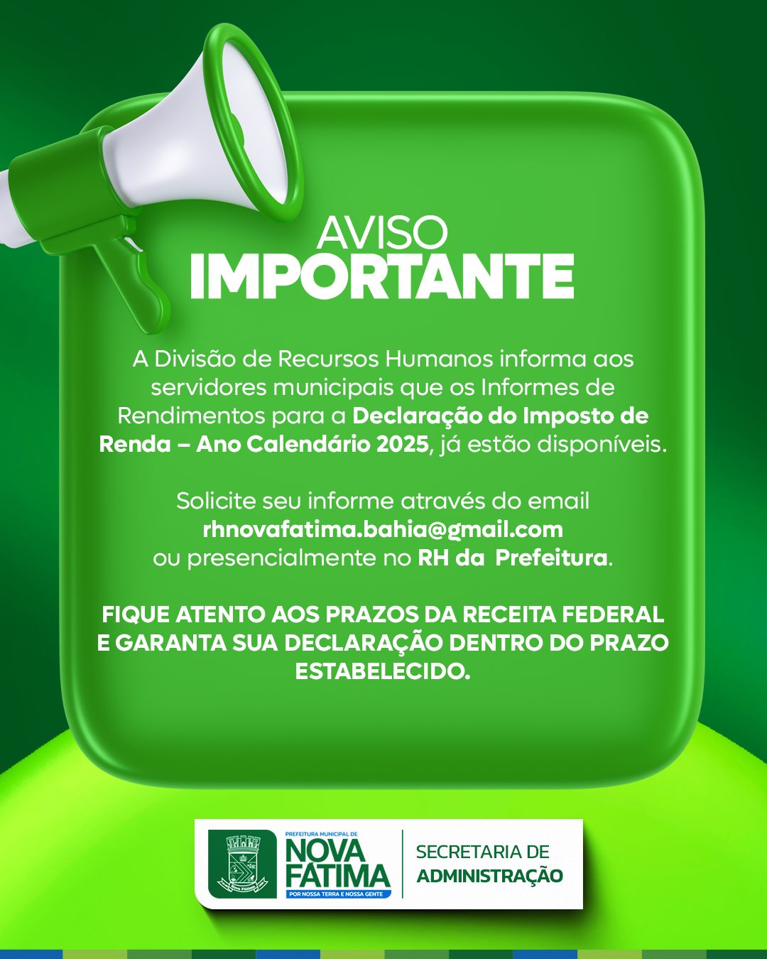 A Divisão de Recursos Humanos informa aos servidores municipais que os Informes de Rendimentos para a Declaração do Imposto de Renda - Ano Calendário 2025, já estão disponíveis.