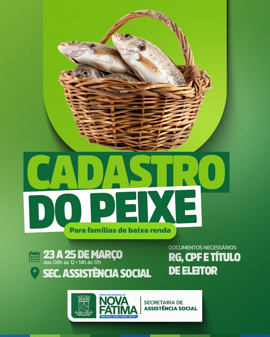 De 23 a 25 de março, das 08h às 12h e das 14h às 17h, estaremos realizando o cadastro na Secretaria de Assistência Social.