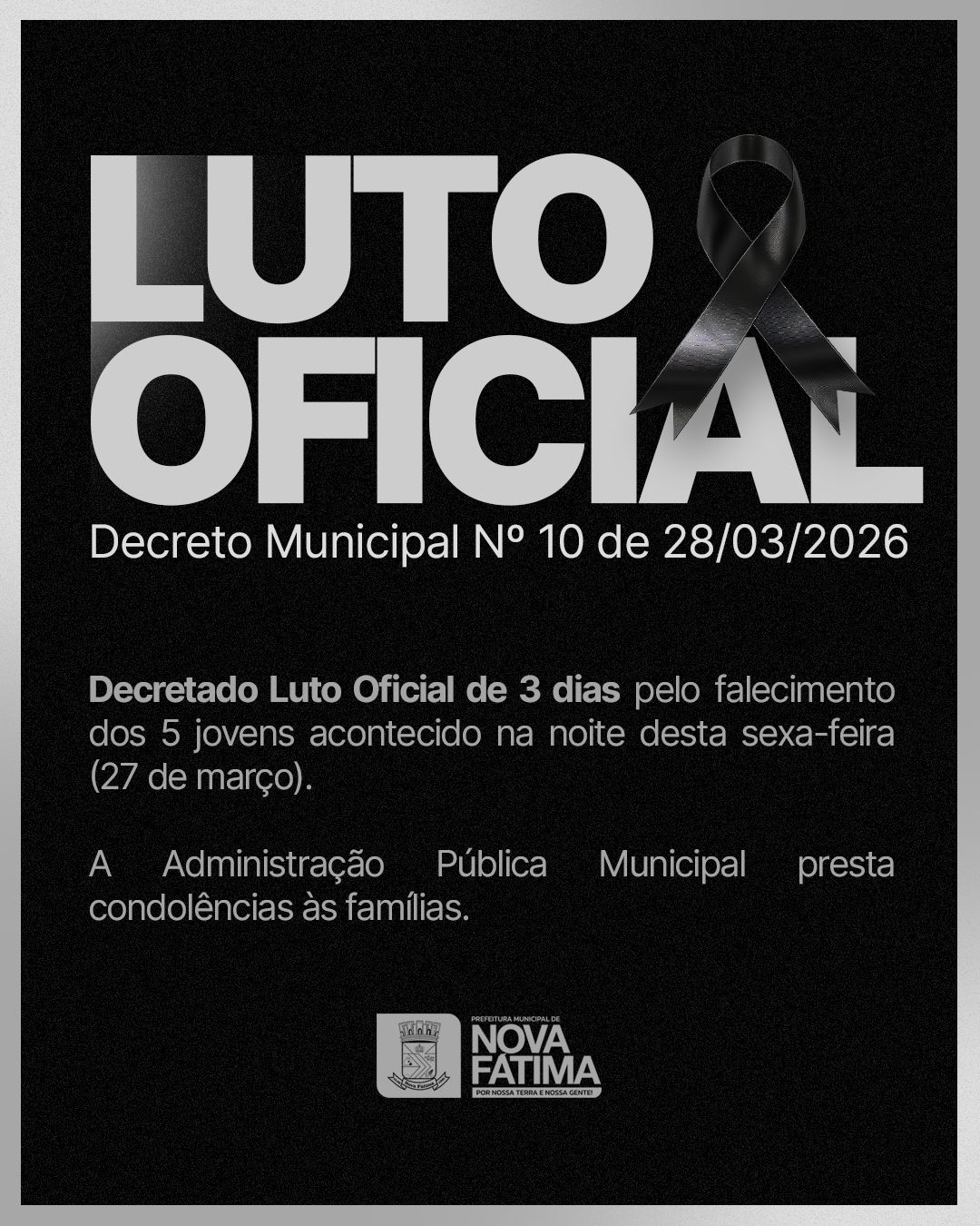 Decreto Municipal N° 10 de 28/03/2026 Decretado Luto Oficial de 3 dias pelo falecimento dos 5 jovens acontecido na noite desta sexa-feira (27 de março). Administração Pública Municipal presta condolências às famílias
